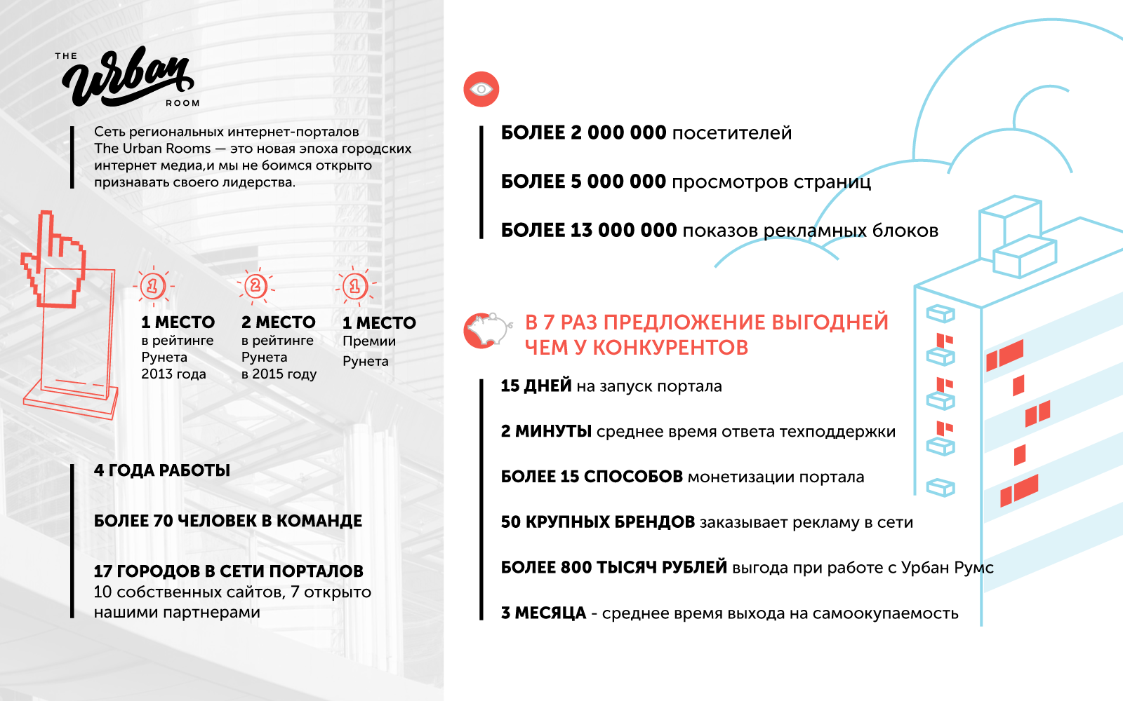 У Урбан Румс есть готовый и проверенный более пятнадцати раз рецепт, как открыть портал в своем городе и не облажаться. Четко следуя нашим инструкциям, пользуясь нашими многочисленными наработками, вы сможете избежать множества проблем с первоначальной раскруткой и монетизацией своего медиа-проекта. Кроме того, вы сумеете значительно сэкономить на этом.